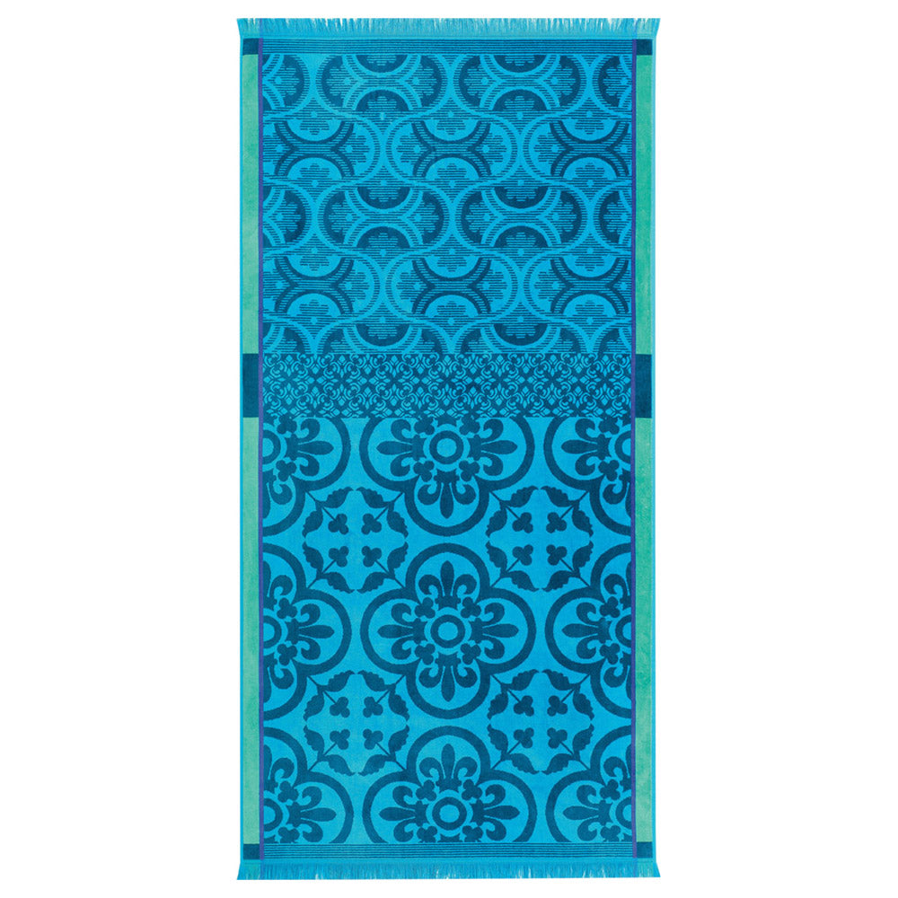 The Le Jacquard Francais Santorin Turquoise Beach towel is the perfect beach accessory -- stylish with a fun pattern and vibrant colors. Double sided velvet and terry, 100% combed cotton. Made in France.