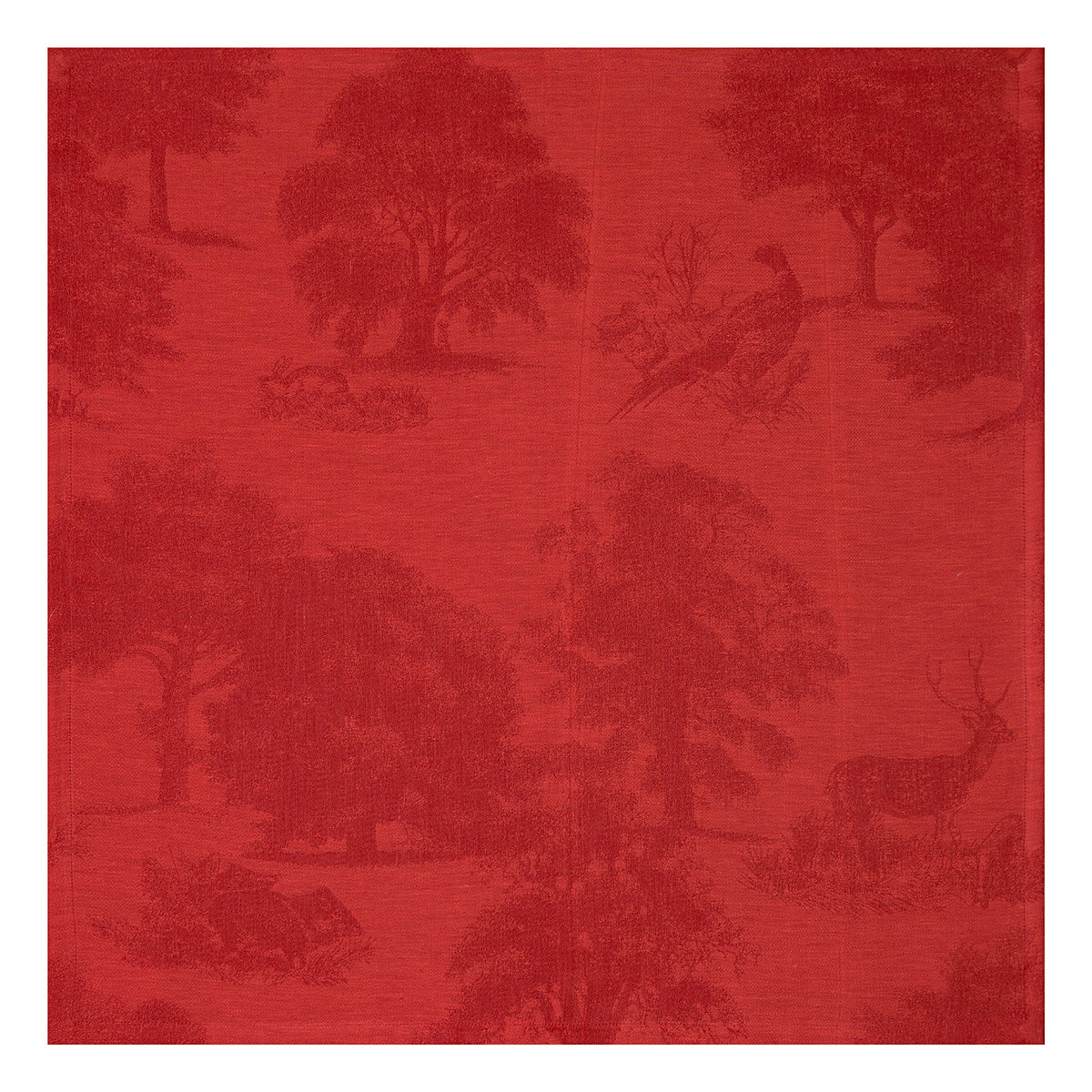 The Le Jacquard Francais Souveraine Red Napkin is inspired by the beauty and serenity of nature. The Souveraine collection will immerse you in the heart of a magical and enchanting forest. Table linens are 100% linen damask. Made in France.