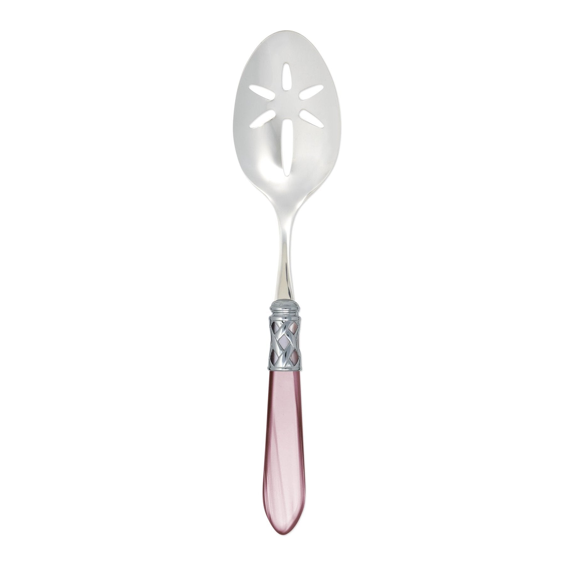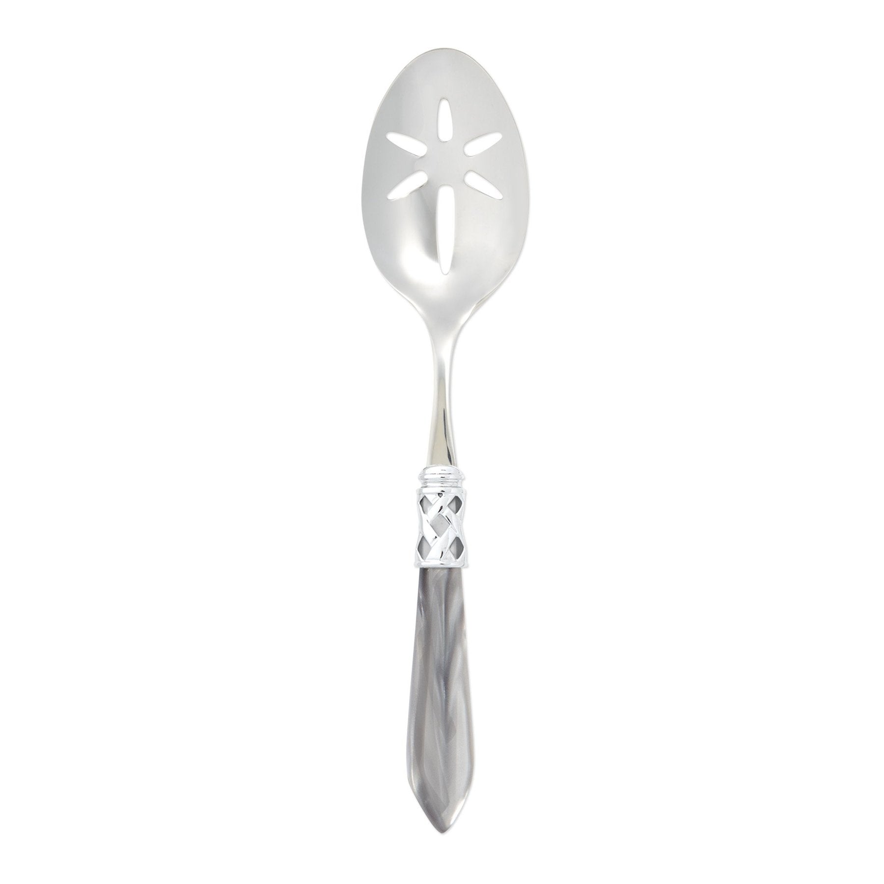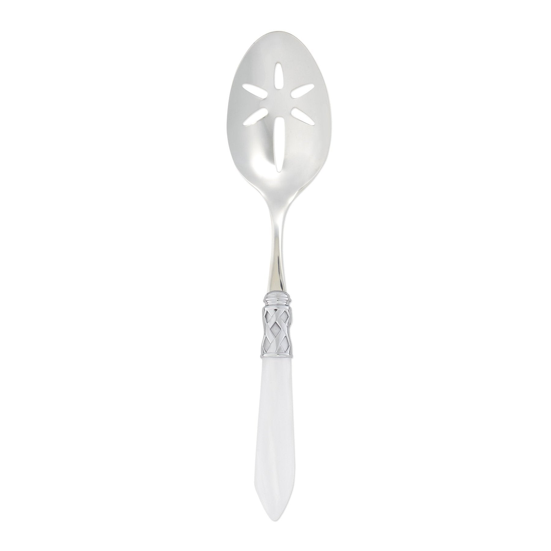 TheVietri Aladdin Brilliant Slotted Serving Spoon features an shiny silver lattice cuff with elegant pearlized handles, and 18/10 stainless steel.  Made by Bugatti in Lumezzane, Italy.