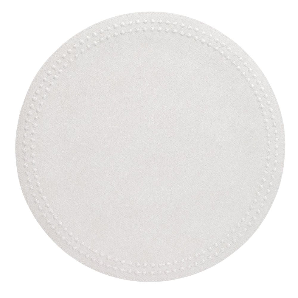 The Bodrum Linens Pearls Antique White/White Placemat has pearl-like embroidered dots around the edge of a round placemat.   Made in Turkey.
