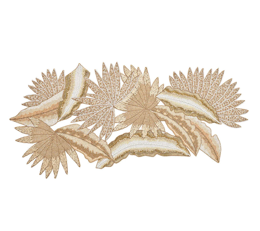 The Kim Seybert Java Runner is inspired by the tropics, featuring a leaf pattern that is embellished with wooden, glass, and plastic beads—hand sewn for an attention to detail not commonly found in other table runners. Its neutral color palette and the use of natural materials like the delicate but sturdy raffia make it an ideal complement to many different dining decor. Imported.