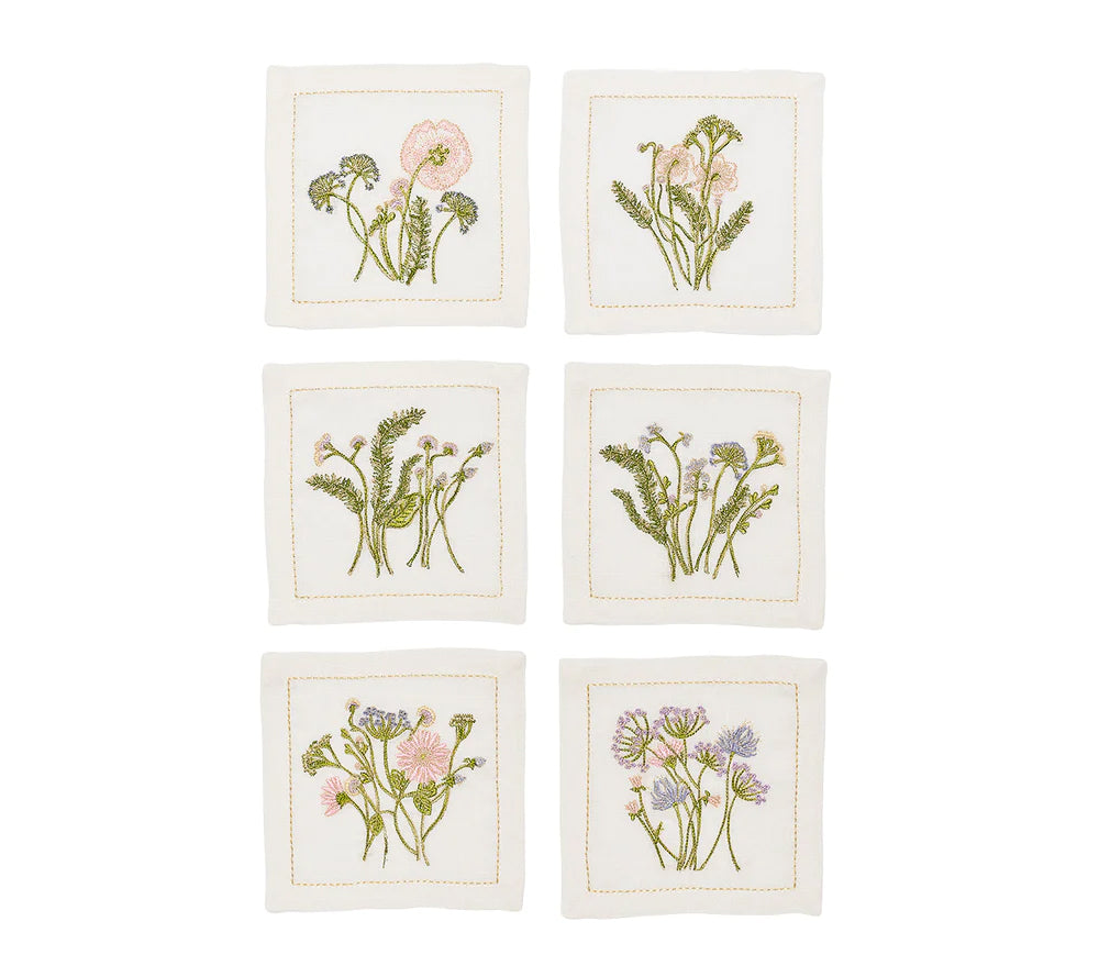 The linen embroidered Kim Seybert Meadow Cocktail Napkins features a distinct hand-sketched garden flower scene, which is then embroidered on to the linen napkin. The delicately embroidered blooms capture the essence of a wildflower bouquet in a sunlit meadow. Use these fanciful napkins to bring an added touch of nature's beauty to your gatherings 100% linen. Imported.