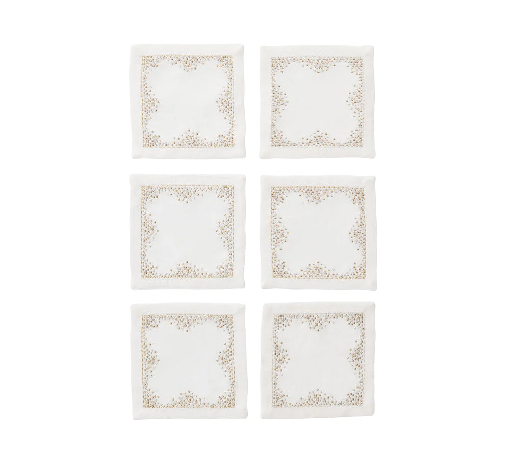 The linen embroidered Kim Seybert Pin Dot Cocktail Napkins feature a spray of festive silver and gold dots that creates an elegant border on the crisp white linen background. 100% linen. Imported.