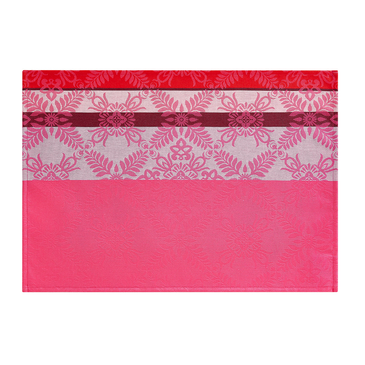 The Le Jacquard Francais Mumbai Pink Collection is a journey, an immersion in the heart of a revisited India. Vivid colors and patterns transport you to a gourmet, spicy table where every detail evokes elegance and spirtuality. Palace ornaments unfold endlessly to build a gourmet, spicy table where pomegranates, pineapples, and lotus hearts are adorned with a multitude of foliage. Made in France.