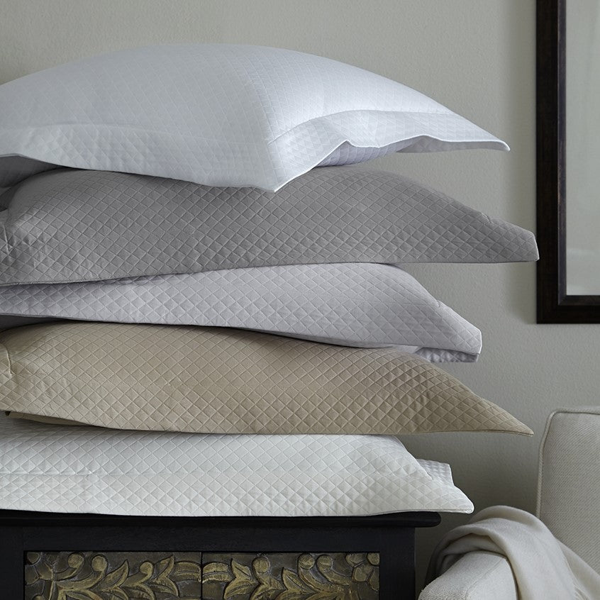 The Sferra Bari Pillow Sham is a lustrous Italian Egyptian cotton diamond pique with a flange border and flap closure. Made in Italy.